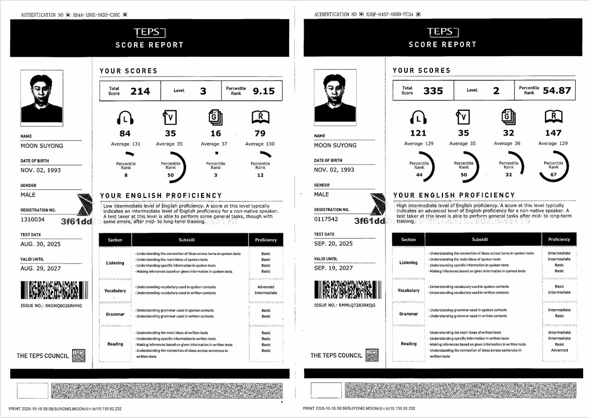 청해(240점) 어휘(60점) 문법(60점) 독해(240점) 총점(600점)