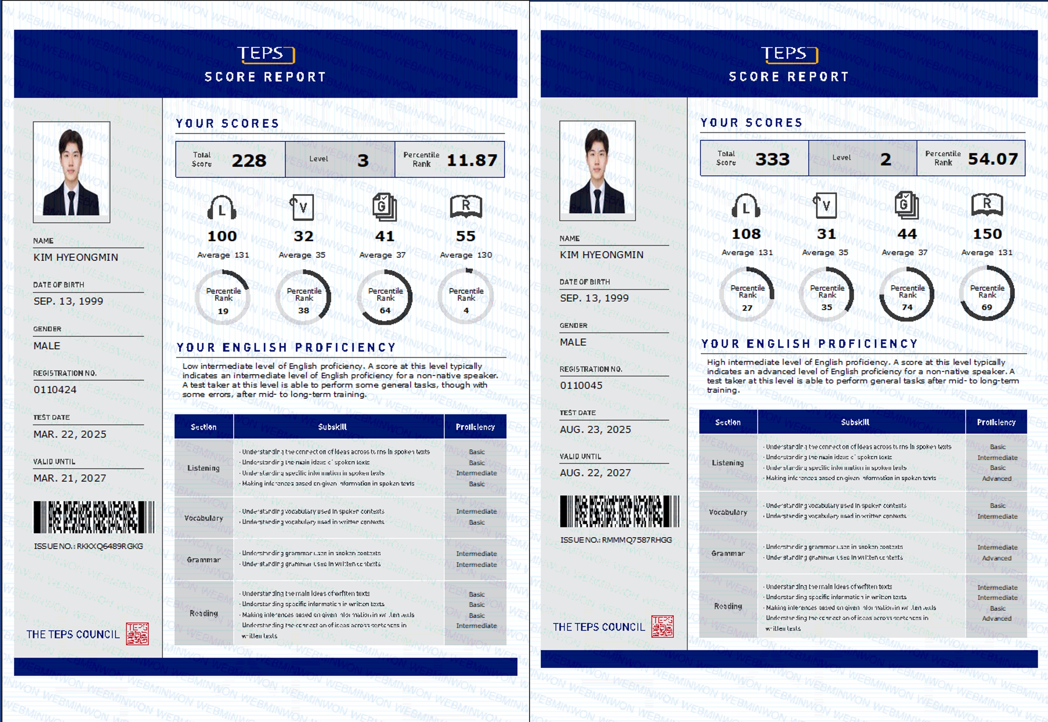 | 수강후 | 108점 | 31점 | 44점 | 150점 | 333점 |